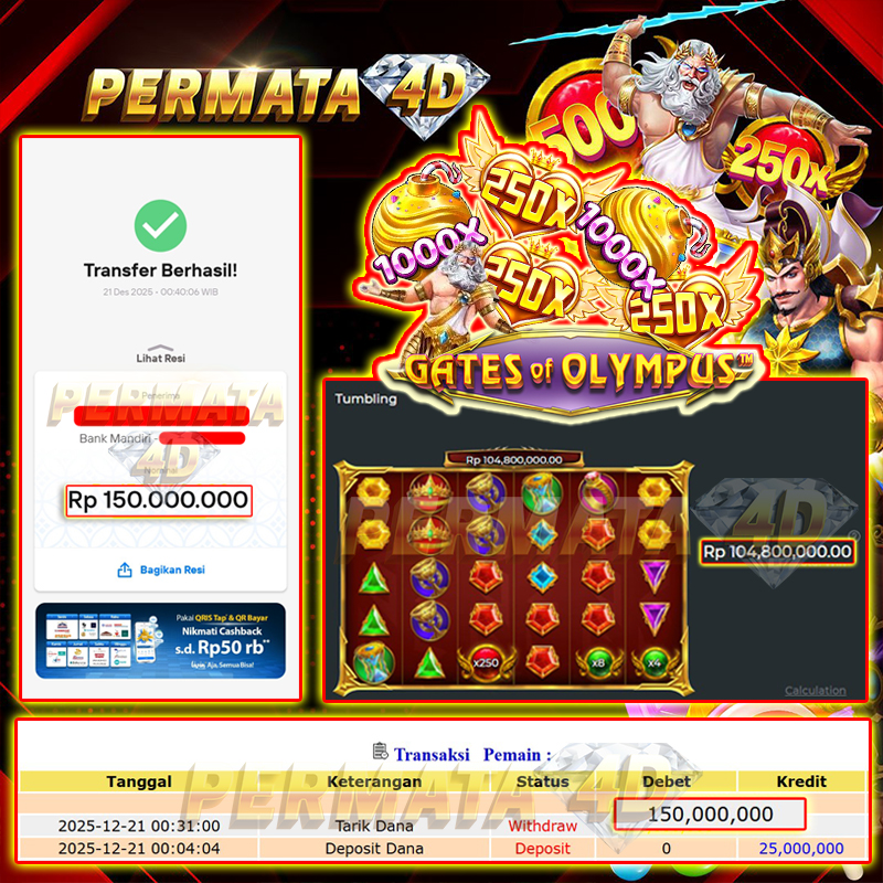 PERMATA4D JACKPOT GATES OF OLYMPUS 1000 Rp. 150.000.000,- LUNAS
