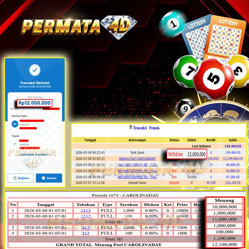PERMATA4D JACKPOT CAROLINADAY Rp. 12.000.000,- LUNAS